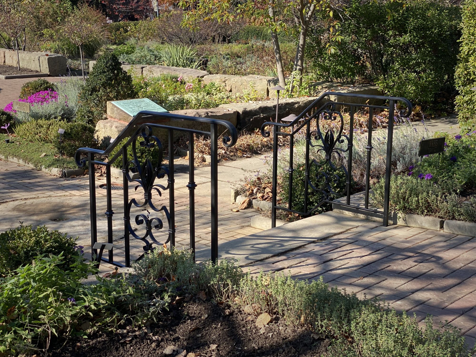 The monastery garden plan is reflected in the series of nine herbally themed sections that make up the WRHS Herb Garden, each of which is reflective of the timeless beauty and usefulness of herbs. Stone walls (salvaged from old barn foundations) separate the various sections. Historic garden features include a 1910 horse-watering trough, two stone horse mounting blocks, a sundial dated 1795, and a round cylinder lawn roller turned on its side to support the metal armillary (sundial) which came from the Shaker Settlement at North Union. A lovely “secret gate” designed by the late Melvin Rose of Rose Iron Works marks an old entrance to the Herb Garden, set into a protective hedging of cockspur hawthorn (Crataegus crus-galli).